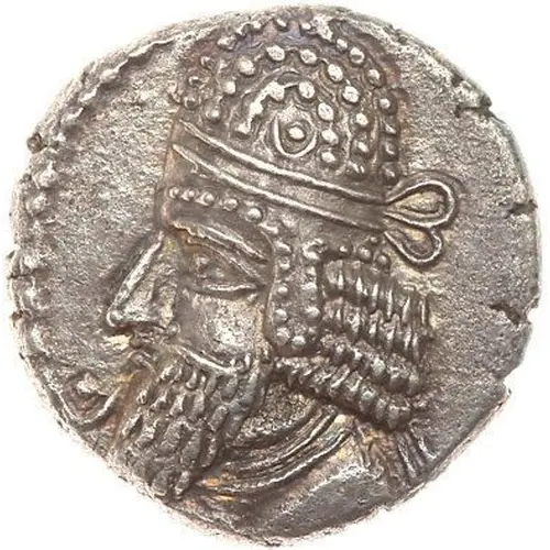 | Opis awersu | Bearded bust of Kapat left, wearing diadem and Parthian-style tiara with pellet-in-crescent, star in crescent before beard, pellet border. |