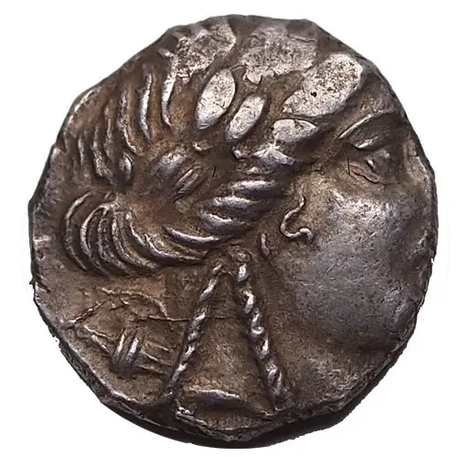 | Opis rewersu | City name above, Kithara (Lyre) in the middle, palm branch to the left, trophy the right. All within incuse square. |