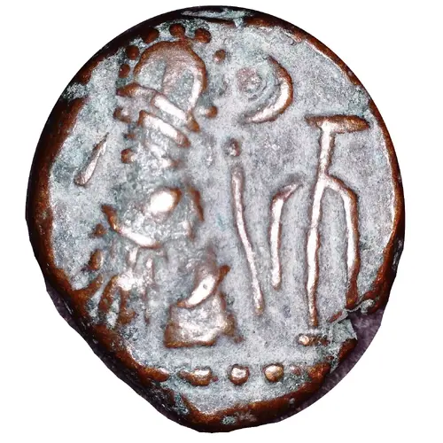 | Obverse description | Long-bearded bust of king facing left, wearing tiara decorated with anchor; there appears to be an anchor symbol in beard. To the right of the bust, a crescent with star, and anchor. Dotted border. |
