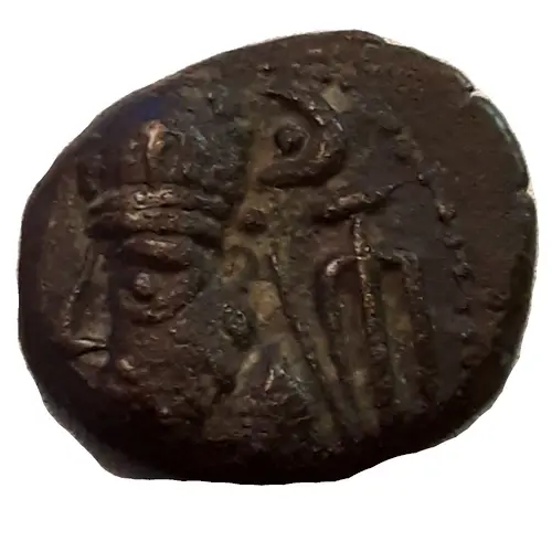 | Obverse description | Long bearded bust left wearing tiara ornamented with anchor; to right, pellet inside crescent above anchor with one crossbar |