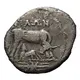 | Beschrijving voorzijde | Cow to the right, head down left looking at a calf to the left that she is suckling; thunderbolt in exergue, all within border of dots. |