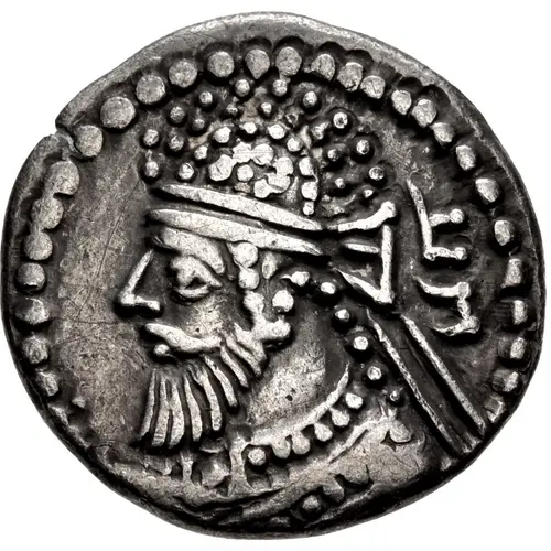 | Obverse description | Diademed bust of bearbed king left, wearing close fitting decorated headress with dotted rays above, with ear pieces and posterior streamers. Behind head Pehlvi legend. |