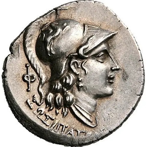 | Opis awersu | Head of Athena to right, wearing crested Corinthian helmet with griffin on the bowl. Behind him the letter Φ and below him the inscription. |