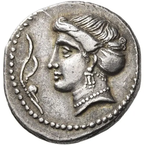 توضیحات روی سکه Head of nymph facing left, hair caught up in sphendone; an aplustre before.