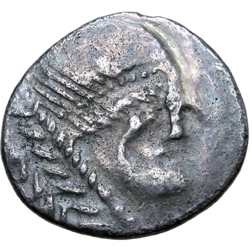 | Descripción del anverso | Stylised head to right; laurel wreath below. |