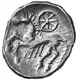 Stylized horse jumping to the left. 7 spoke wheel above.