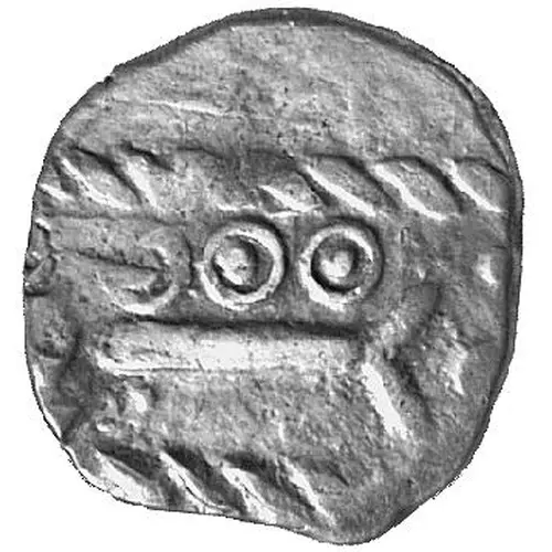 | Description de l’avers | Three circles with a center over a Y-shaped ornament, above and below a braid. |