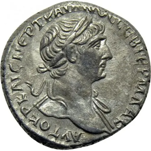 Laureate bust of Trajan, with paludamentum on left shoulder, viewed from front, left. |