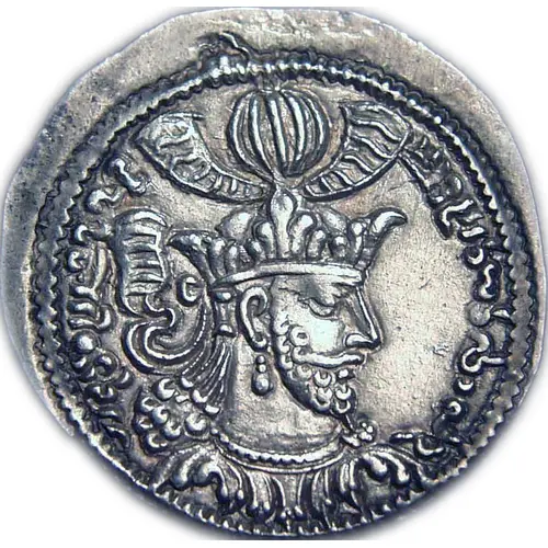| Obverse description | Bust of king to right, crown of three large palmettes, surmounted by fluted globe with large fillet, bushy hair, point of beard drawn through ring: ear-ring, necklace; bust below necklace formed by leaves of palmettes. Parsik legend (The palmettes below the bust of the Hephthalites) |
