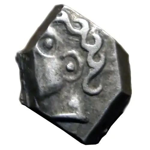 | Obverse description | Head to the left, with for hair a single curvilinear row of interlaced S, the first of which forms the forehead and the last ends in a loop on the neck; below the eyebrow, eye made of a point on an arc of a circle; straight nose rounded at the end; two-point lips; pointed chin; pointing ear; fairly long neck ending in a raised horizontal line. |