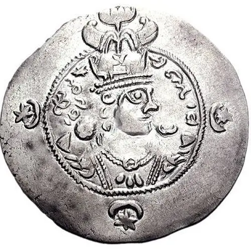 | 正面描述 | A bust of the king facing right. The crown is in the form of three teeth, wings and crescent with a star. The diadem is two rows of `pearls`. To the left there is a star, and to the right of the crown a crescent with a star. The king`s hair is in a knot, and he wears an earrings consisting of three beads, He has a beard and moustache. There is a neacklace in the form of one rowof smell beads around his neck. `Royal`ribbons turned upwards flutter under his shoulders; and there is a crescentunder his left shoulder. On his shoulders are crescents with stars. There is a double rim around the picture. On the coin`s rim there are three crescents with stars. There is a counermark on the obverse. Pahlavi legend |
