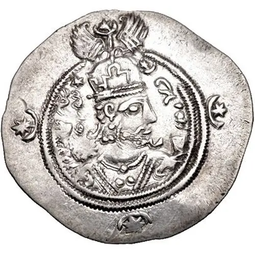 | Obverse description | A bust of the king facing right, wearing mural crown with frontal crescent, two wings, and star set on crescent; ribbon on left shoulder, crescent and ribbon on right; stars flanking crown Pahlavi legend |