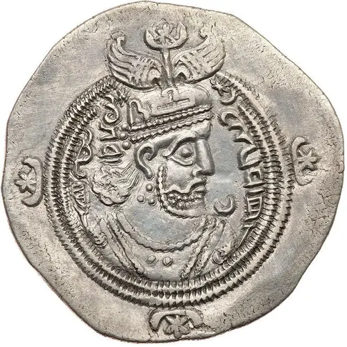 | Aversbeschreibung | Bust of Yazdgard III right, wearing mural crown with frontal crescent, two wings, and star set on crescent, ribbon on left shoulder, crescent and ribbon on right, stars flanking crown, star-in-crescents in margin. |