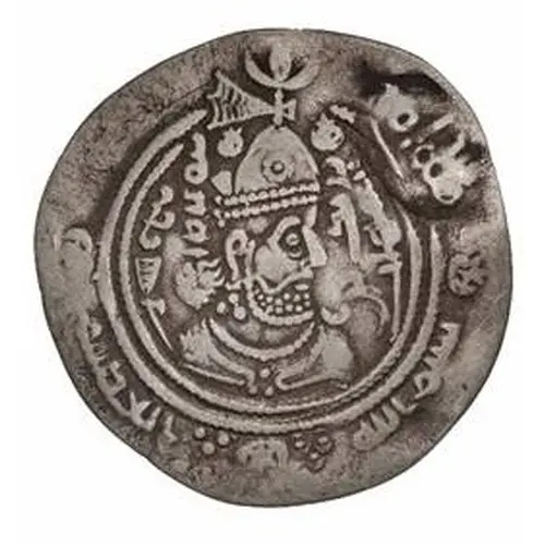 | Obverse description | Sasanian bust right, wearing helmet with ‘weather-vane’ crest To right of bust, Script in Arabic In second and third quadrants of margin, Script in Arabic |