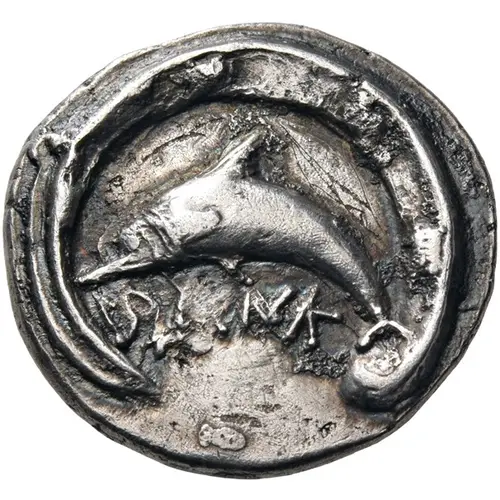 | Obverse description | Dolphin to left within the sickle-shaped open harbor of Messina, the shoreline shown with several square warehouse buildings. |