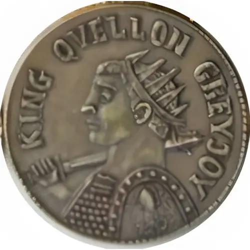 | Obverse description | Portrait of Quellon Greyjoy; lettering around edge. |