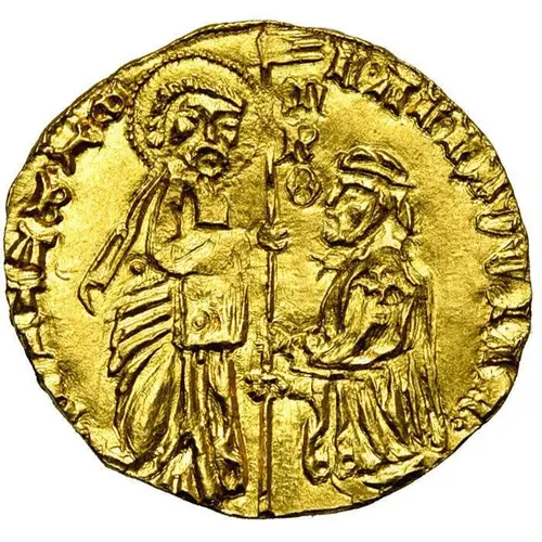 At left, Saint John, nimbate, handing the banner of the Order to the grand master who is kneeling facing him left. |