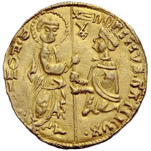 Descrizione del dritto Saint Mark standing, giving gonfalone to the kneeling doge.