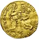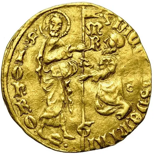 At left, Saint John, nimbate, handing the banner of the Order to the grand master who is kneeling facing him left. |