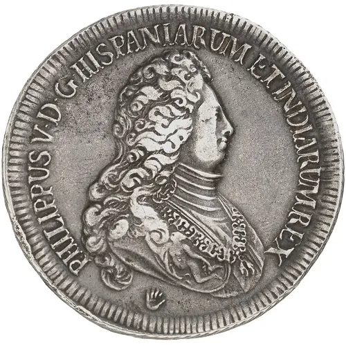 PHILIPPUS V • D • G • HISPANIARUM ET INDIARUM REX (Translation: Phillip V, by God`s grace King of the Spains and the Indies) |