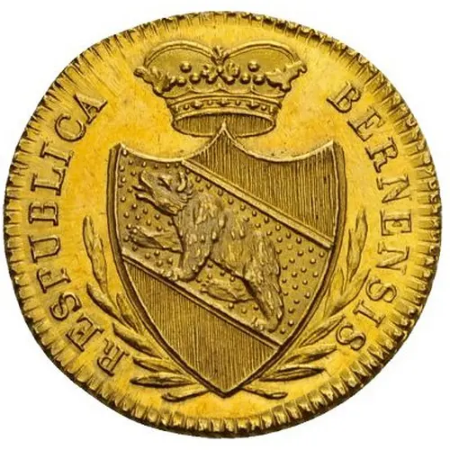 Obverse description Crowned coat of arms of Bern within sprigs.