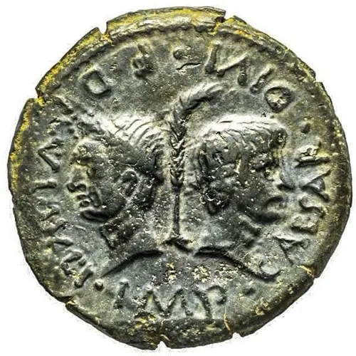 | توضیحات روی سکه | Laureate head of Caesar left, and bare head of Octavian right; palm brand between heads. |