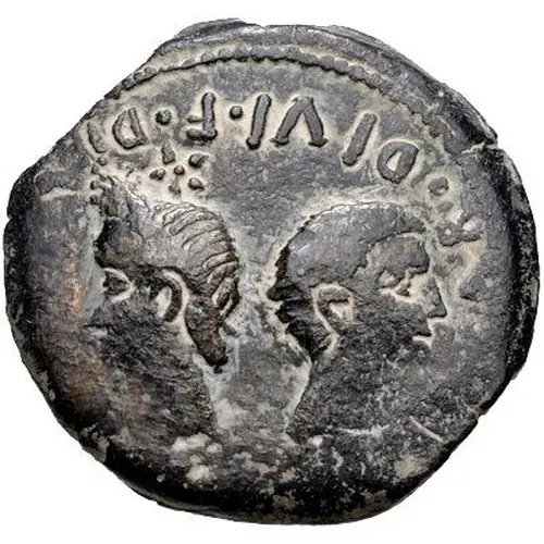 | Descrizione del dritto | Laureate head of Caesar left and bare head of Octavian right, star in upper field. |