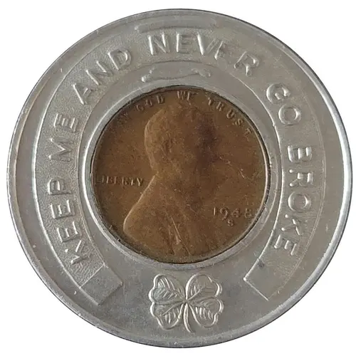 | Reverse description | KEEP ME AND NEVER GO BROKE On a horseshoe surrounding this bronze cent in the center with a shamrock at the base of the horseshoe |