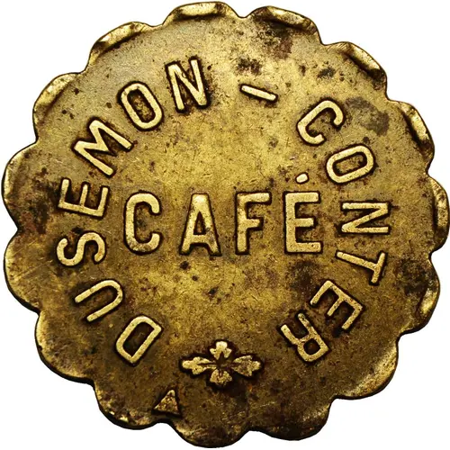 In the field, the word CAFÉ surrounded by a circular legend featuring the owners` names and a floral motif. In the foreground, the mint`s hallmark consists of a triangle with a mirrored leaf and the initials T & Cie. |