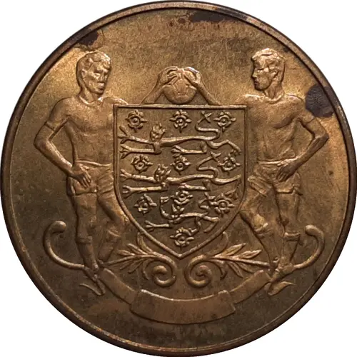 | Obverse description | Two footballers standing either side of a shield containing three lions, holding a football above. |