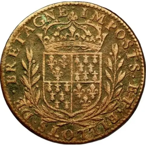 Quartered shield of France and Brittany, stamped with a half-royal, half-ducal crown, encircled by two palms. A dot above the crown`s central finial. |