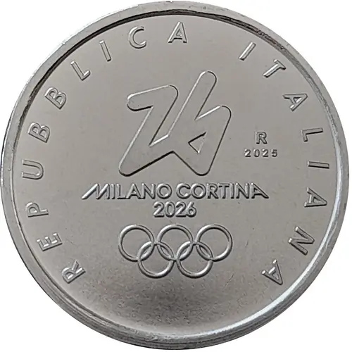 Descripción del anverso In the centre, the official logo of the Milano Cortina 2026 Winter Olympic Games. Arche-shaped, the inscription “Repubblica Italiana”. In the right field, the “R”, identifying the Mint of Rome, and “2025”, the year of the coin’s issue.