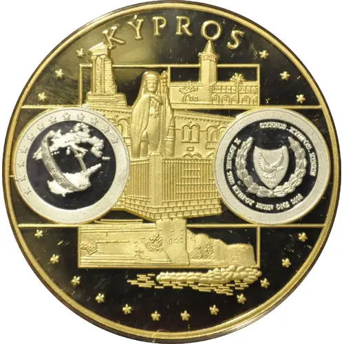 | Descripción del anverso | Kypros on the front, with 2 silver objects, surrounding images of Cyprus |