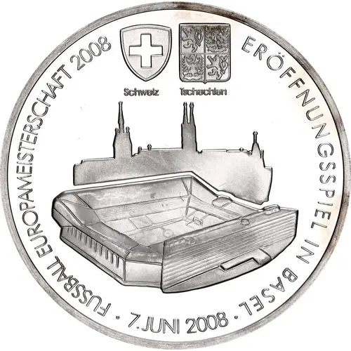 | Obverse lettering | FUSSBALL EUROPAMEISTERSCHAFT 2008 ERÖFFNUNGSSPIEL IN BASEL Schweiz Tschechien 7.JUNI 2008 |