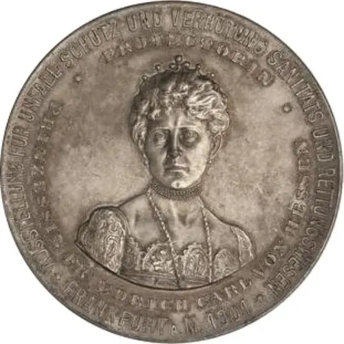 | Obverse lettering | AUSSTELLUNG FÜR UNFALL - SCHUTZ UND VERHÜTUNG SANITÄTS UND RETTUNGSWESEN FRANKFURT A.M. 1901 PRINZESSIN FRIEDRICH CARL VON HESSEN PROTECTORIN |