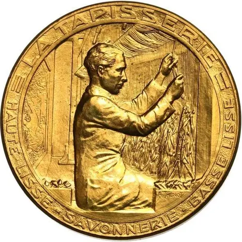 | Obverse description | An upholsterer working on a loom, signed: R. THENOT |