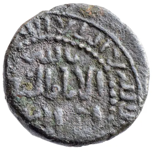 Technical/Grading: This copper fals, measuring 18mm and weighing 4.29 grams, exhibits characteristics common to medieval hand-struck coinage. High-points for figural types generally include facial features like the nose and chin, or headdress details. For calligraphic designs, the thickest parts of letters or ornamental flourishes would be most susceptible to wear. Technical strike quality varies significantly; some examples are well-centered with sharp details, others show off-center strikes, weak areas, or flan irregularities, inherent to the era's minting process.