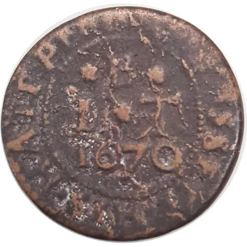 | Надписи аверса | IOn · BASSETT · HIS · HALF · PENNY · ♦ B ♦ I ♦ T 1670 |