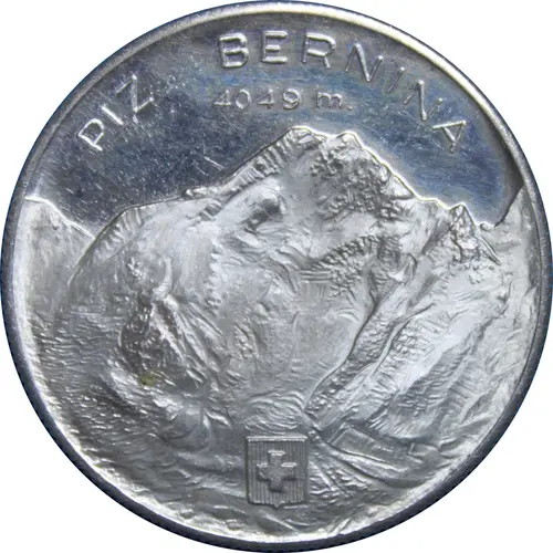 Image of the Bernina mountain range. Wording above and the swill emblem at the 6 o`clock position. |