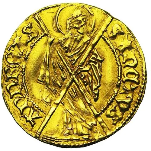 Full length figure of Saint ANdrew, facing forward holding his cross |