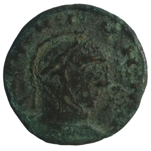 Descrizione del dritto Bust of Constantine I, right, crest-helmeted, laureate, cuirassed. Degenerate lettering.