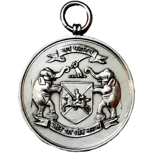 Obverse description Coat of arms of state, devanagari legend Jai Mahadev above and Jin ghar Jin takht below.