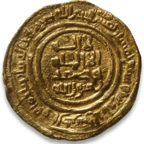 | Obverse lettering | FIeld: la ilah / illa allah / muhammad / rasul allah Margin: bism allah duriba hadha’l-dinar bi-baladat al-iqbal kursi al-daylam sana sab’ wa khamsin khamsmi’a (Translation: Field: no god but God, Muhammad is the messenger of God Margin: in the name of God, this dinar was struck in the Town of Fortune, Kursi al-Daylam, year seven fifty, five hundred) |
