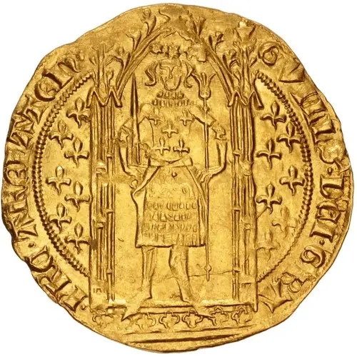 | Obverse description | Crowned figure standing facing within Gothic arch; semé of seven lis to left and right, holding sword, and fleur-tipped scepter. |