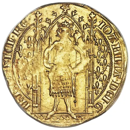 | Reverse description | Ornate cross fleurée with central pellet-in-rosette; crowns in angles; all within angled tetralobe; lis in spandrels. |