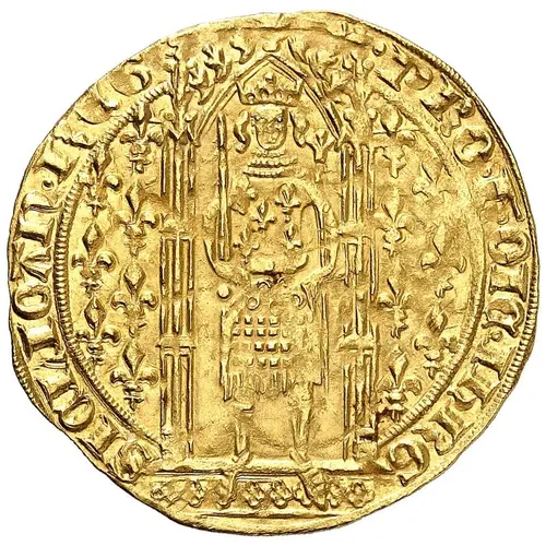 | Reversbeschreibung | Ornate cross fleurée with central pellet-in-rosette; crowns in angles; all within angled tetralobe; lis in spandrels. |