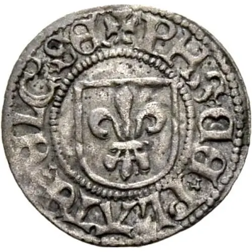 | Descripción del anverso | Fleur-de-lis on shield within beaded circle. |