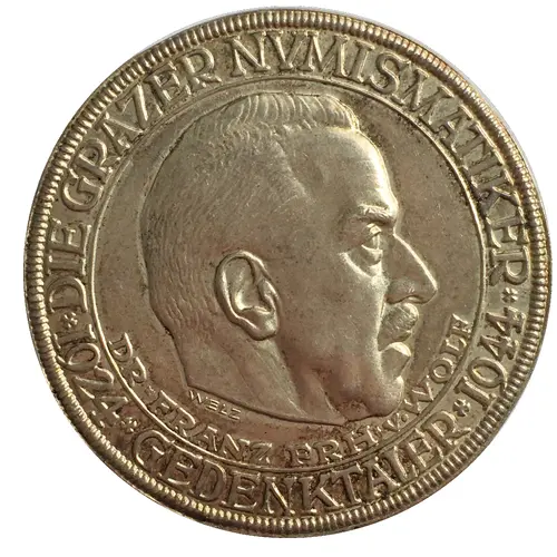 | Obverse lettering | DIE GRAZER NVMISMATIKER WELZ DR. FRANZ FRH. v. WOLF *1924* *1944* GEDENKTALER |