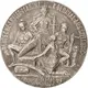 Croned Germania seated on a throne and holding a sword, three kneeling figures surrounding her, the first with sword, schield and helmet, the second with an anchor and the thirs as an African with an elephants ivory tusk and a packed colonial goods. |