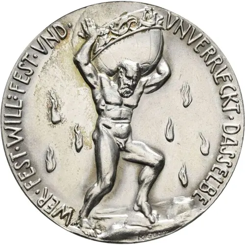 Atlas with globe on his shoulders, small flames around. |